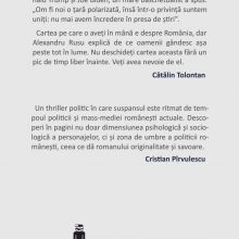 Un thriller politic în care suspansul este ritmat de tempoul politicii și mass-mediei românești actuale. Descoperi în pagini nu doar dimensiunea psihologică și sociologică a personajelor, ci și zona de umbre a politicii românești, ceea ce dă romanului originalitate și savoare.